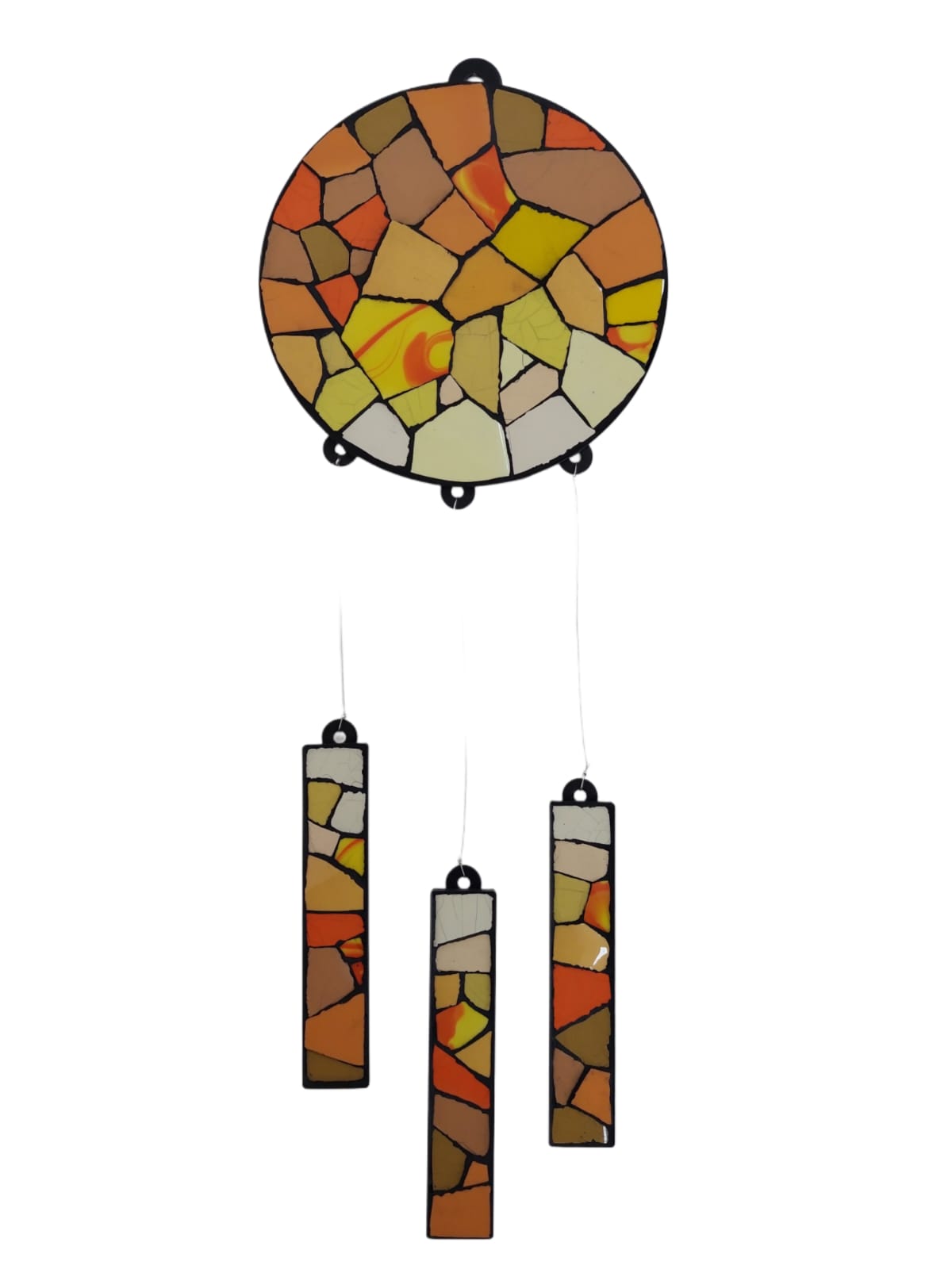 El kit consta de una pieza central, tres colgantes, un metro de tanza de acero y 6 prensa tanzas para que lo armes con el largo que quieras y